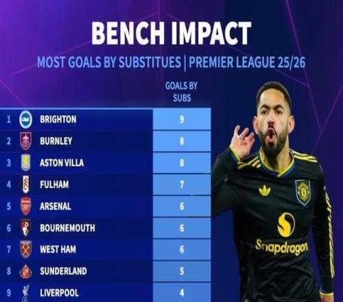 本赛季英超球队替补进球榜:布莱顿9球第1,曼城、曼联1球垫底