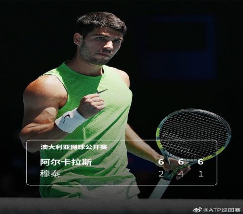 体育播报1月23日宣 澳网男单第三轮,阿尔卡拉斯3-0轻取穆泰晋级16强。