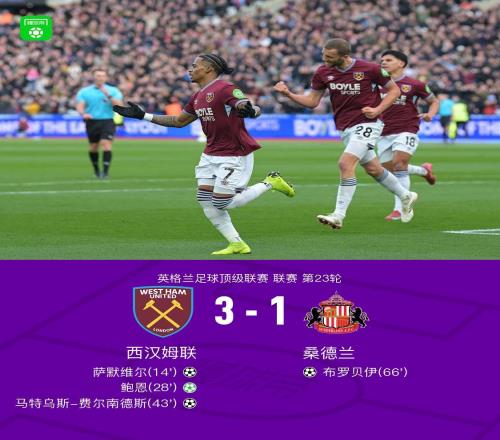 西汉姆联31桑德兰,鲍恩点射+助攻,费尔南德斯、萨默维尔破门