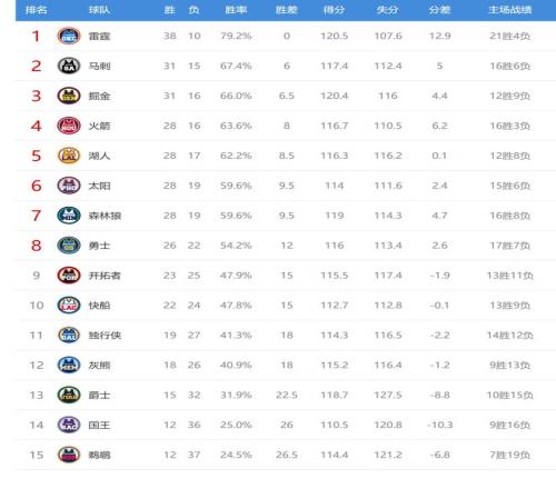 雷霆赢球后结束2连败,战绩38胜10负排名联盟第一,鹈鹕输球后12胜37负排名西部垫底。