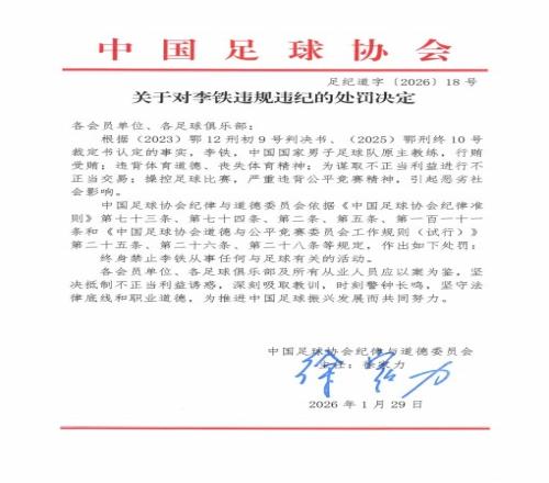 足协发布“假赌黑”整治处罚结果,中国国家男子足球队原主教练李铁因行贿受贿、操控足球比赛,终身禁止李铁从事任何与足球有关的活动。